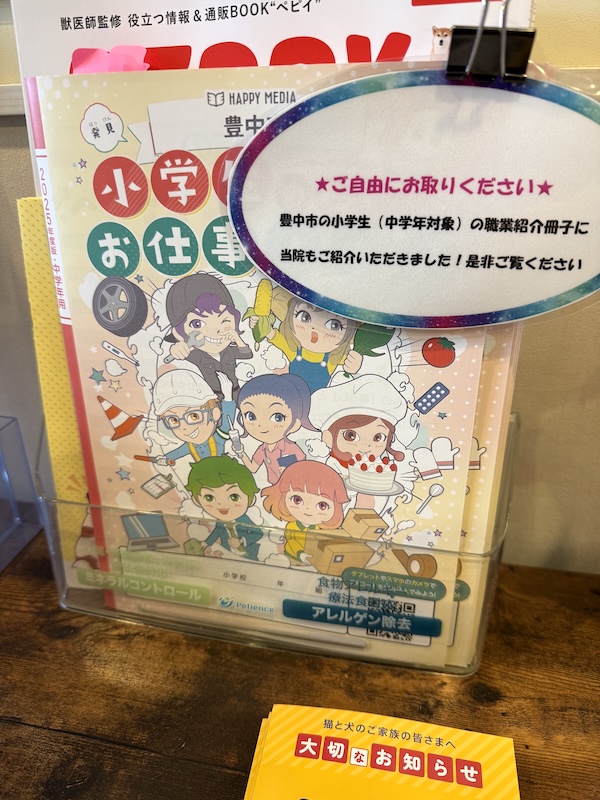 いくつか当院にも届きましたので、待合室で配布しています。数量に限りがありますが、もし、お子様がいらっしゃるご家庭で、動物病院の仕事にご興味があれば、遠慮なくお持ち帰りください