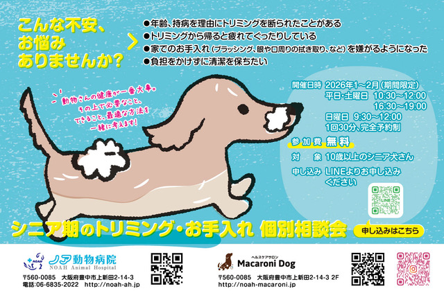 シニア期のトリミング・お手入れ 個別相談会実施中 HOME > お知らせ > シニア期のトリミング・お手入れ 個別相談会実施中 2026年1月25日お知らせ ノア動物病院併設ヘルスケアサロン Macaroni Dogよりお知らせ シニア期のトリミングやお手入れについて、不安・疑問・お困りごとはありませんか? 1~2月限定で無料の個別相談会を行なっています!